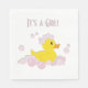 Cute little yellow rubber ducky swimming in pink bubbles with the words It's a Girl for the baby shower.
