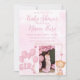 A light pink, watercolor-style background. A gold, thin, rectangular frame is centred within the image. Pink, cartoon-style balloons with the word "GIRL" spelled out in balloon letters are clustered within the frame's left quadrant. A small, light brown teddy bear, dressed in a light pink shirt and shorts, is in the bottom-right quadrant of the frame. The background has soft, diffused pink washes and a subtle marbling effect. Small, pink hearts and stars are scattered around the frame. Available as printable invitations or instant downloads.