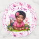 Cute it's a girl baby shower confetti with a cute African-American baby girl with a pink flower in her hair, Pretty pink floral background with pink and green text.