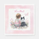 Girl's pink and sage green baby shower paper napkins. It's a girl! Sweet baby girl sitting next to her little black and white Mini Aussie puppy dog in a patch of pretty watercolor flowers. Pink and sage green butterfly and pretty wildflowers.