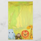 A fun jungle scene with trees, vines, and a river as the background and an elephant, monkey, lion and giraffe looking on. Outlined in a glitter like frame. Great for a boy or girl baby shower.