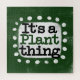 "It's A Plant Thing" is a cute text design in green with black and red text, along with a white accent shape and white textured whimsical dots surrounding it.
