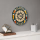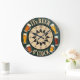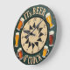This is a round wall clock featuring the phrase "ITS BEER O'CLOCK" in light, three-dimensional block letters against a dark green, heavily distressed border. Six different beer glasses and mugs, all topped with foam, are illustrated around the circumference. The beige clock face features black star-like geometric shapes originating from the center. The distressed, rustic green finish gives the clock an antique appearance. The design may look real due to the high detail and three-dimensional texture in the artwork.