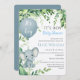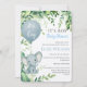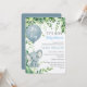 A heartwarming design featuring a cute little baby elephant sitting peacefully amidst soft eucalyptus leaves and delicate trailing vines. The baby elephant, with its big, gentle eyes and floppy ears, radiates innocence and charm. It holds a pastel-coloured balloon sweetly in its trunk, adding a playful and whimsical touch to the scene. The eucalyptus leaves and vines wrap around gently, creating a serene, natural backdrop in soft green hues. The combination of the botanical elements and the adorable elephant creates a perfect blend of nature and cuteness, ideal for baby showers, nursery decor, or children's invitations. This gentle illustration evokes feelings of warmth, love, and peaceful joy, capturing the beauty of early childhood and tender beginnings.