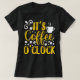 It's Coffee O'Clock in yellow with white accents--coffee cup and coffee beans.