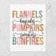 This colourful and fun fall design features a list of autumn favourites, including "Flannels," "Hayrides," "Pumpkins," "Sweaters," and "Bonfires." The text is presented in a bold, uppercase font with each word filled in with a different warm, earthy hue—ranging from soft pinks and oranges to muted greens and blues—perfectly capturing the cosy and vibrant spirit of the season. The words "hayrides" and "sweaters" are written in a flowing script, adding a touch of elegance and creating a nice contrast with the bold block letters. Decorative flourishes frame the script text, adding to the overall charm and appeal. This design is perfect for fall.