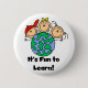 Three stick figure kids surround a world globe and text reads "It's Fun to Learn!" on school themed T-shirts, cards, mugs, stickers, buttons, and other gear!