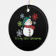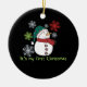 This image features a cheerful cartoon snowman wearing a Christmas hat and scarf, surrounded by colorful snowflakes against a black background. The bright green text at the bottom, "It's my first Christmas," celebrates a first Christmas moment, making it an adorable and festive design.