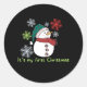 This image features a cheerful cartoon snowman wearing a Christmas hat and scarf, surrounded by colorful snowflakes against a black background. The bright green text at the bottom, "It's my first Christmas," celebrates a first Christmas moment, making it an adorable and festive design.