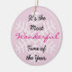 It's the Most Wonderful Time of the Year Pink Christmas Ornament with pretty white snowflakes and a white polka dot pink bow and ribbon the back. Make sure to edit the year on the back!