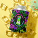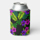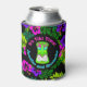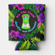 A fun can cooler with a tiki theme, a tiki mask in green on a tropical Hawaiian print background in blue, pink and green on black printed with your names for a colourful island themed couple's shower.