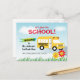 This back to school postcard features a design of a school bus with a banner reading: Welcome! The text at the top reads: It's Time for SCHOOL! Customisable text near the bottom allows you to add teacher's name, and school. The background is blue sky with white fluffy clouds, green grass and two cute smiling flowers.