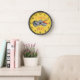 "It's time to cochet" is written on a round clock decorated with a black, grey and white skein of yarn, two bright red crochet hooks, all on a mustard yellow background. It's the perfect gift for the craft room or for anyone who loves to crochet. The clock has black hands and numbers.