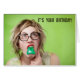 A nerdy looking woman with a detergent pod in her mouth saying It's your Birthday! The inside reads, "Have fun! But don't do anything stupid!"