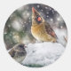 A female cardinal in the snow appears to be keeping her eye on the other bird.