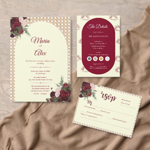 Burgundy Ivory Floral Rattan Wedding CollectionDesigned by Shanielle Grace Lemorinas