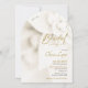 Imagine a soft, ethereal backdrop of delicate ivory blooms, gently unfurling in a serene, diffused glow. This dreamy backdrop provides the perfect canvas for your bridal shower details, which truly shine in exquisite gold script lettering. The elegant calligraphy dances across the card, adding a touch of classic luxury and warmth, while crisp, clear details ensure all your guests have the information they need. But the thoughtful design doesn't stop there! The back of the invitation boasts a pristine, plain ivory backdrop.