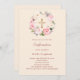 A soft ivory blush background, decorated with watercolored pink and white flowers in a wreath and a golden cross. Personalize and add a name and details.