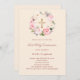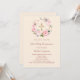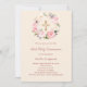 A soft ivory blush background, decorated with watercolored pink and white flowers in a wreath and a golden cross. Personalize and add a name and details.
