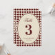 This ivory & burgundy checkered wedding table number features a heritage-style checker pattern in deep burgundy and soft cream tones for a warm, vintage-timeless look. The mix of playful-retro character and elegant contemporary typography creates an understated old-money fall / winter mood with subtle whimsical charm. Designed to coordinate beautifully with the Ivory & Burgundy retro suite, it brings classic nostalgia to a modern table setting.