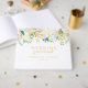 An elegant and romantic wedding guestbook design featuring a watercolor botanical frame in watercolor ivory and pink flowers and green foliage.