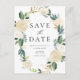 Announce your wedding in style with this beautiful save the date postcard. Featuring a delicate floral wreath of ivory and cream flowers, paired with lush greenery and elegant gold foil accents, this design is both timeless and modern. Perfect for any wedding theme, you can customise it with your names, wedding date, and other details. Whether you're hosting a rustic, classic, or contemporary wedding, this postcard will set the right tone and get your guests excited. It's a simple and stylish way to share your big news and ensure your loved ones save the date for your special day.