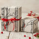 This modern winter and holiday season wrapping paper features larger print hand-drawn birch trees with red Cardinal birds perched on branches in black ink, against an elegant ivory background.