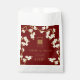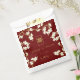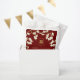 Oriental peach / plum blossoms, spring flowers in cream / ivory / white on a dark burgundy red / matte brass gold background with a simple rectangle double happiness symbol wedding party favour gift box. An elegant and romantic floral chinese themed wedding party favour bag design which is whimsical, modern and classy.