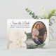 These beautiful cards are the perfect way to let your friends and family know to save the date for your upcoming wedding. They feature a romantic design with a single long-stemmed ivory, white, or cream coloured rose reflecting in a pool of water with waves and ripples with your photo in an oval shaped frame. The caption reads Save the Date with space for your names, the date, and location. The back is a marbled beige or cream colour.