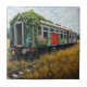 Abandoned and decayed lost spaces tile. An old long abandoned vintage train off the tracks covered in graffiti and ivy while nature reclaims her space.