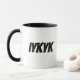 white 11oz coffe mug with black handle and black inside and black lettering IYKYK