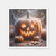 A carved jack-o-lantern glows warmly with dangling spiders and covered with cobwebs