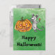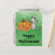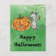 A cheerful opossum hold up a match and poses next to a lit jack-o-lantern with an equally cheerful grin. This Halloween cartoon is in watercolor and ink.