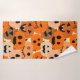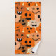 This towel set has a pale orange washcloth, a light brown hand towel, and a bath towel with a design of jack-o-lanterns with different faces repeating in each quarter.