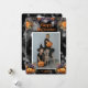 Photo Halloween card featuring jack-o'-lanterns wearing black hats and a photo adorned with purple and orange flowers. Easily personalise this beautiful Halloween card with your photo, the family name and text.