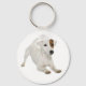 This cute key chain features a white Jack Russell Terrier puppy dog with a brown eye patch highlighted against a crisp white background.