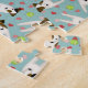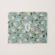 This cute Parson / Jack Russell Terrier jigsaw puzzle features a randomly arranged pattern of illustrated JRTs / PRTs, each with varied brown and black head and ear markings and an adorable head tilt, with scattered tennis balls and red and pink confetti hearts on a light greyed teal background - name and monogram are customisable - by katz_d_zynes
