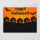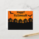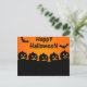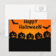 It's a "Happy Halloween" with these fun Jack-O-Lanterns and flying bats. Bright orange background with black shadowing. Design created by Black Brook Photography with graphic from Pixabay September 2014.