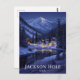 Capture the cozy serenity of Jackson Hole, Wyoming, USA, with this breathtaking vintage-style postcard featuring a winter night scene. The design showcases a small village of illuminated log cabins nestled beside a reflective river, surrounded by snow-covered pine trees and dramatic, moonlit mountains. This travel poster is perfect for skiers, winter sports enthusiasts, nature lovers, and anyone who appreciates rustic mountain scenery. Ideal for sending holiday greetings, keeping as a cozy souvenir, or framing as rustic lodge decor.