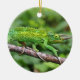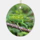 Photograph of a bright green reptile called a Jackson's Chameleon, also called a Three Horned Chameleon, walking along a branch surrounded by green leaves and vines in a botanical garden in Hawaii. Go green!