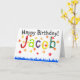 A bright, colourful birthday card for a young man of any age named Jacob! The design is made from a handpainted paper collage and the inside is left blank for your own message. See also matching gifts and apparel.