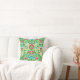 Throw pillow in a vintage William Morris jacobean floral pattern, digitally enhanced and coloured, in leaf green, coal red, and cerulean blue, on a white background