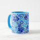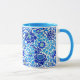 Mug in a William Morris wallpaper design of flowers in navy and cobalt blue, accented with lime, with cerulean blue, leafy vines, against a white background