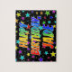 This vibrant and exciting birthday-themed jigsaw puzzle design has the message "HAPPY BIRTHDAY, JADE" with the characters having a colourful rainbow spectrum inspired gradient pattern, in addition to a lively stars background pattern. A colourful puzzle like this might be a fun way to acknowledge the birthday of somebody named Jade. [~Z0000468]