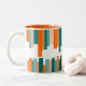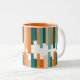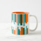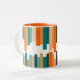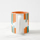 This mug has a pattern of lines in teal and orange in varying lengths.