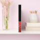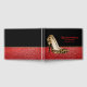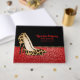 Fashionista event guest book done black and a red glitter look, with graphics of a pair of jaguar spotted stiletto high heels. Personalise the text fields for your special celebration.