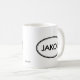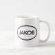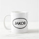 Check out this Jakob mug! Is your name Jakob? Or do you have a husband, boyfriend, male family member or male friend named Jakob? If so, this "Name Stamp" mug is exactly the gift that you're looking for! The design features "Jakob" in big black lettering surrounded by two ovals, one thin and one thick.