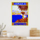 Jamaica ~ Vintage Travel Canvas. Wonderful vintage travel poster shows a woman surrounded by flowers and standing by the sea, carrying a fruit basket on her head. In the background are mountains and a village. Images of oranges are in each corner of the poster. Caption reads: Jamaica ~ the gem of the tropics ~ Beautiful ~ healthy ~ accessible ~ Tickets by all steamship lines here. This vintage poster has been beautifully enhanced and restored to its former brilliance.