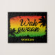 Wah Gwaan Jamaican hello puzzle with black silhouette palm trees over a rasta colored sunset