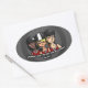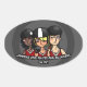 Here come 3 members of a Roller Derby Team, wearing their team colours red, black and white. Each holds a different position. A Jammer, with curly black hair wearing a white star Derby helmet. The Pivot complete with her black stripes under her eyes, with blonde hair sporting the striped cap over her helmet and finally a feisty brunette blocker with a fresh black eye. The text beneath reads: Jammers and Pivots and Blockers. OH MY!